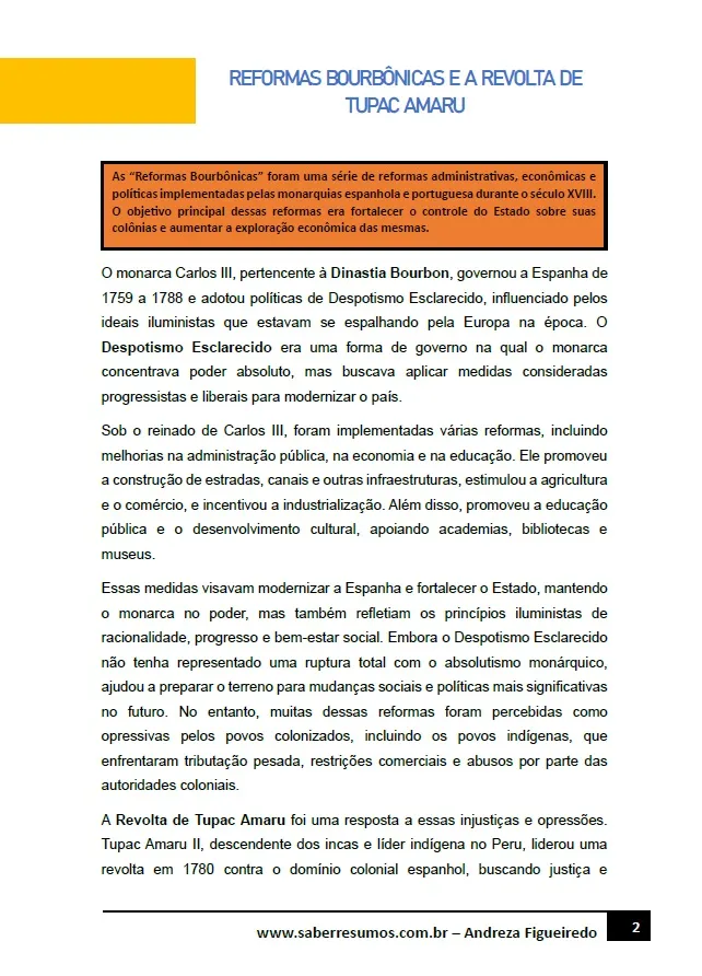 403 - História - As Independências da América Espanhola - Reformas Bourbônicas e a Revolta de Tupac Amaru - 8º ano - PDF com 5 páginas
