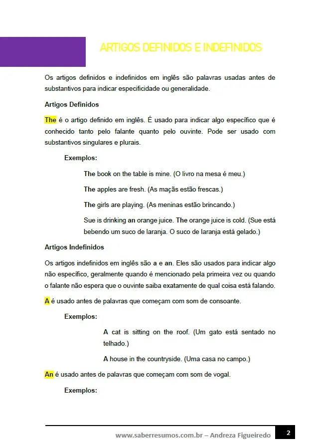450 - Inglês - Classes de Palavras - Artigos Definidos e Indefinidos - 6º ano - PDF com 4 páginas