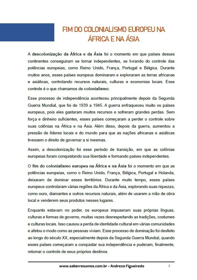 686 - História - Descolonização da África e da Ásia - Fim do Colonialismo Europeu na África e na Ásia - 9º ano - PDF com 37 páginas