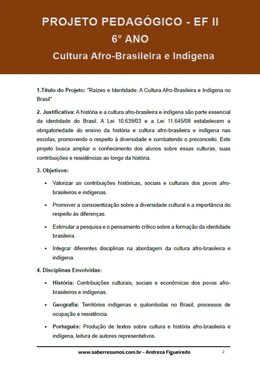 836 - Projeto Pedagógico - Cultura Afro-Brasileira e Indígena - 6º ano - PDF com 30 páginas